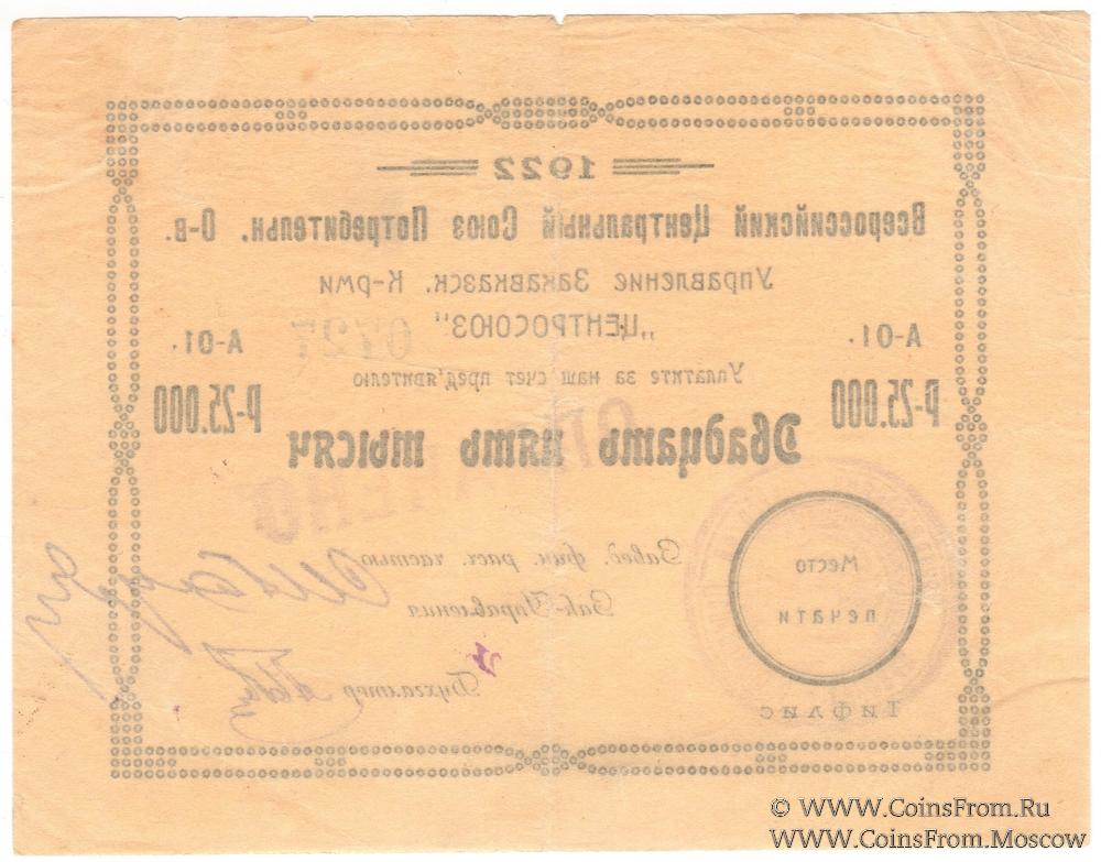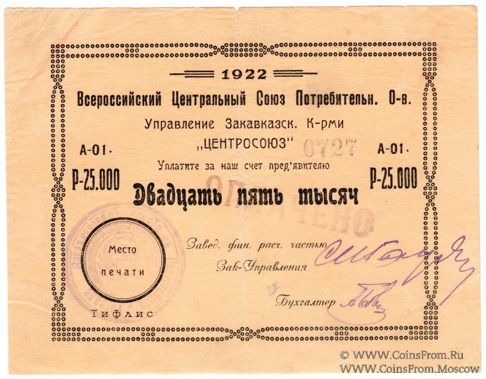 Серия А-01. Бумага тонкая (калька). Управление Закавказскими Конторами "Центросоюз". Всероссийский Центральный Союз Потребительских Обществ.