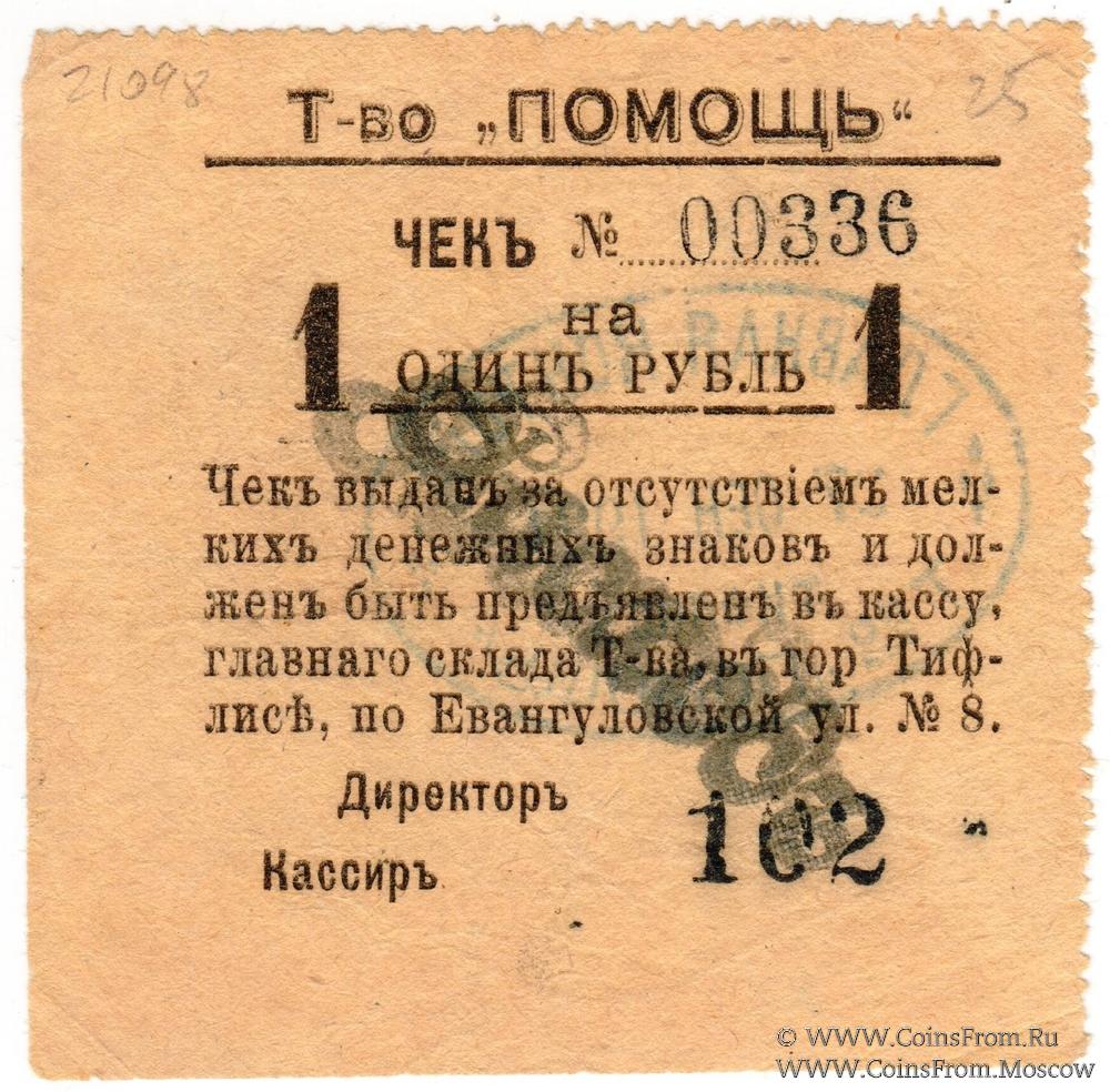 Чек. Аверс: надпечатка "102", "расходъ". Буквы узкие. Реверс: овальная печать главной конторы Товарищества "Помощь". Товарищество "Помощь", г. Тифлис.