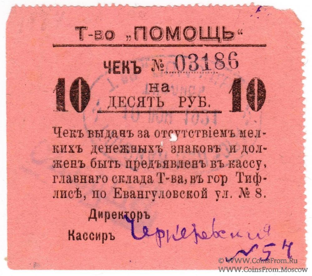 Чек. Реверс: овальная печать главной конторы Товарищества "Помощь"; с надпечаткой "выдано". Товарищество "Помощь", г. Тифлис.