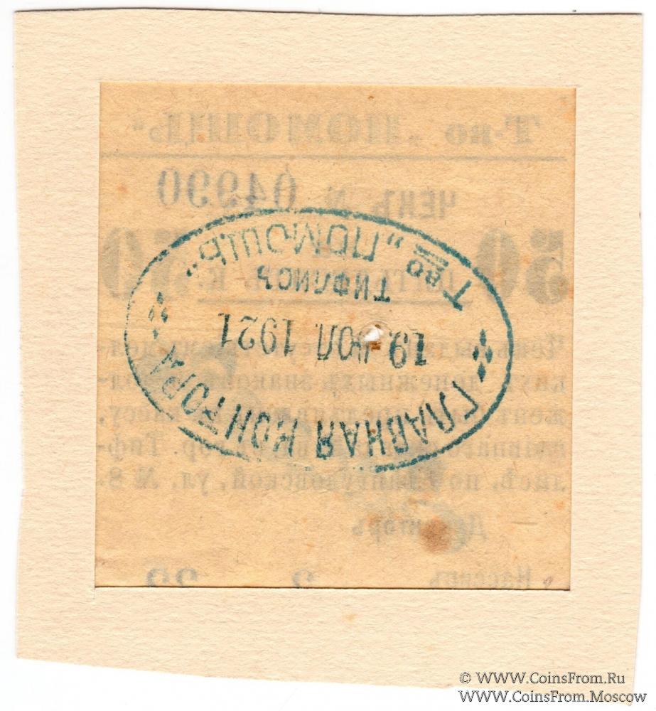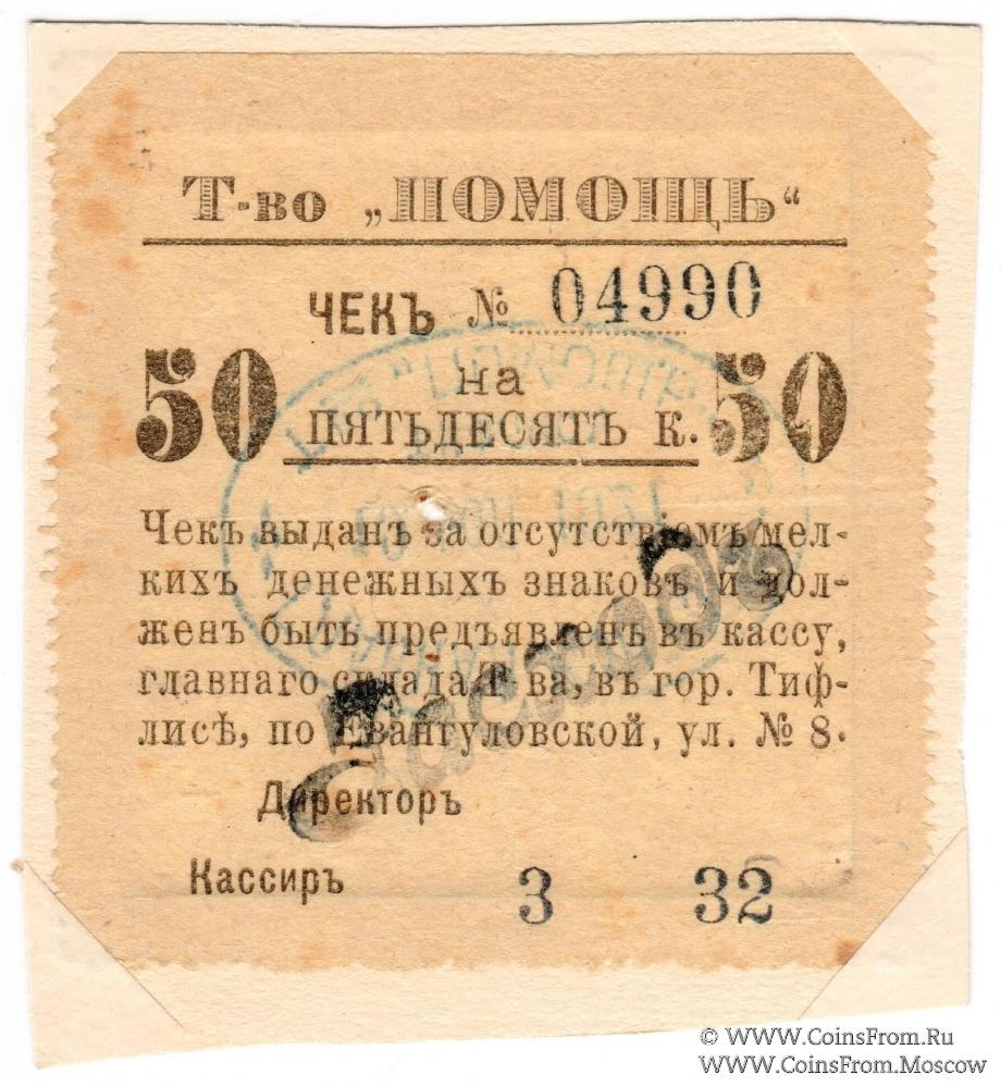 Чек. Аверс: надпечатка "расходъ". Реверс: овальная печать главной конторы Товарищества "Помощь". Товарищество "Помощь", г. Тифлис.