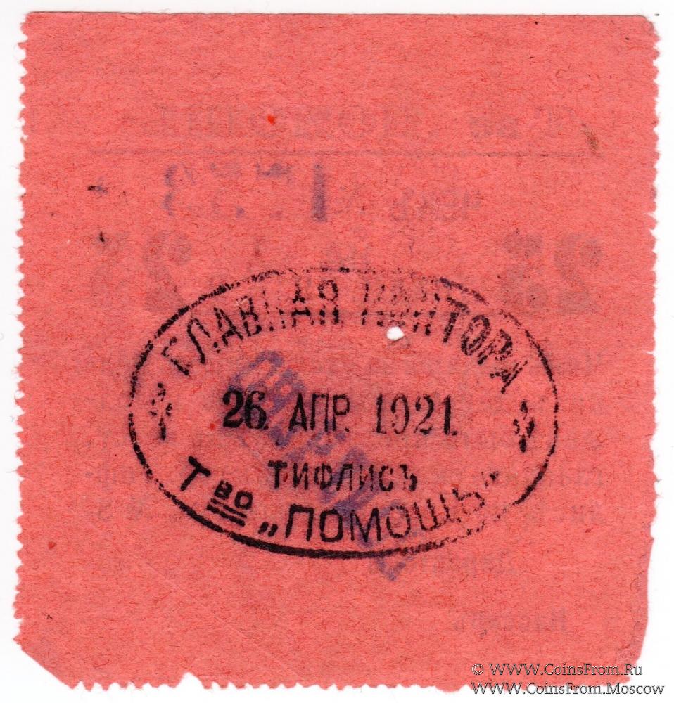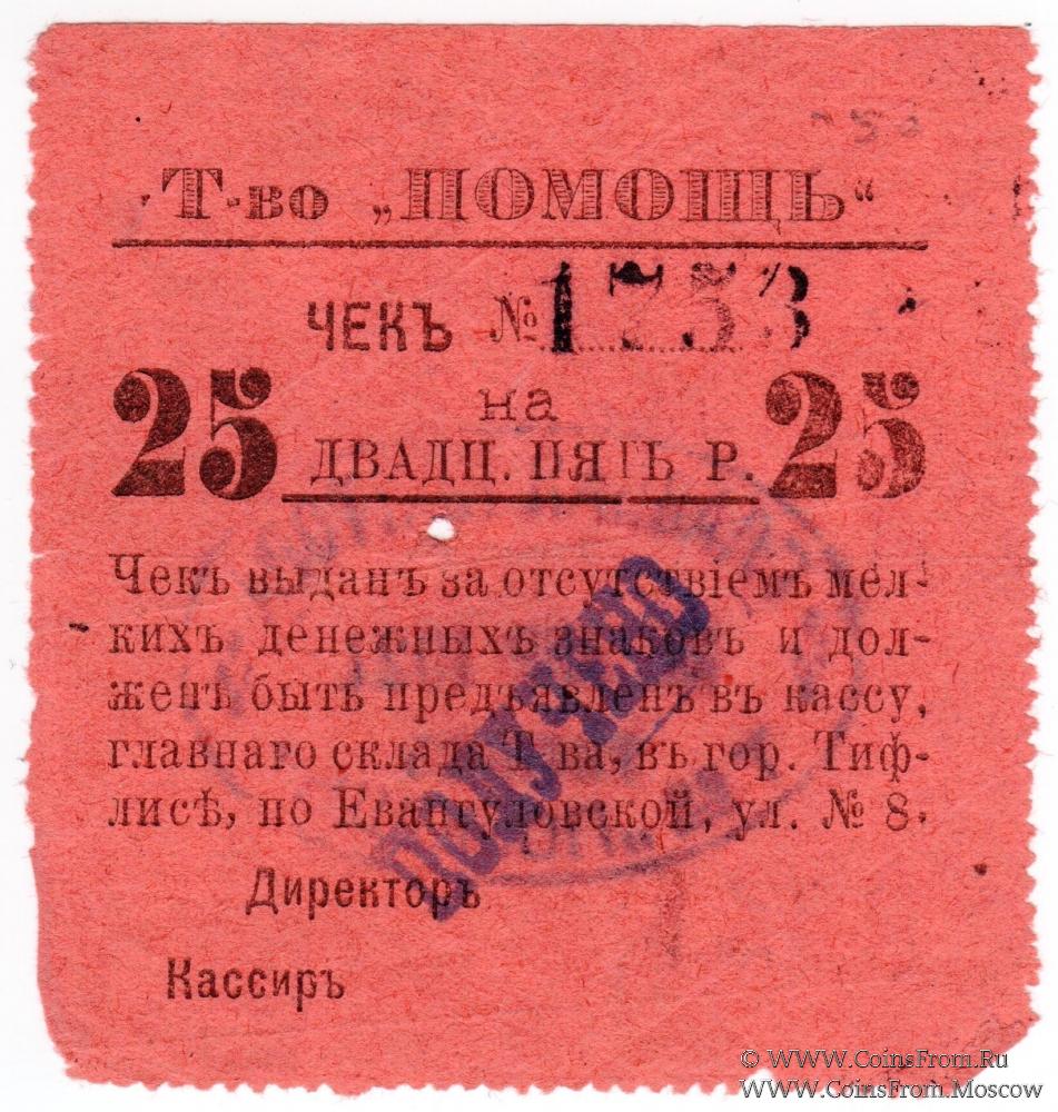 Чек. Аверс: надпечатка "получено". Реверс: овальная печать главной конторы Товарищества "Помощь". Товарищество "Помощь", г. Тифлис.
