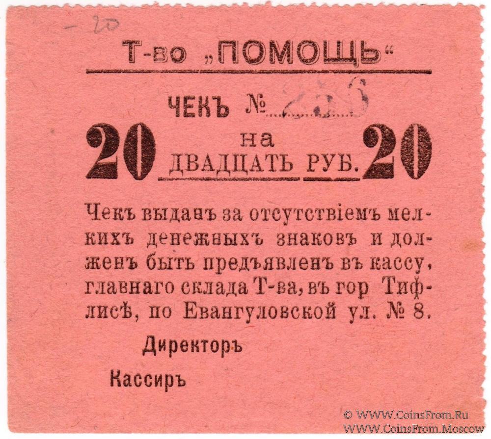 Чек. Бланк. Товарищество "Помощь", г. Тифлис.