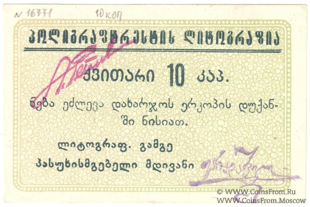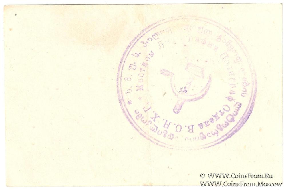 Печать круглая: Изображение серпа и молота (по центру) / "Местком Литографии Полиграф Отдела В.С.Н.Х.Г. *" (по кругу на двух языках: русском и грузинском).