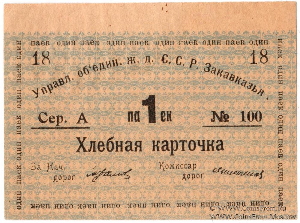 Хлебная карточка без даты. Серия А. Голубая. В верхних углах на аверсе цифра "18". Управление объединенных железных дорог С.С.Р. Закавказья.