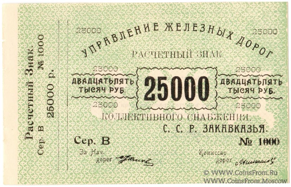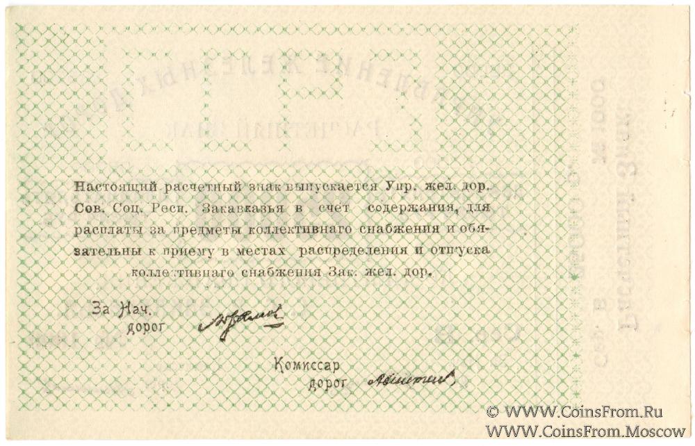 Расчетный знак коллективного снабжения без даты. Бумага белая. Вариант 2 написания буквы "Я" и подписей. Управление железных дорог С.С.Р.Закавказья.