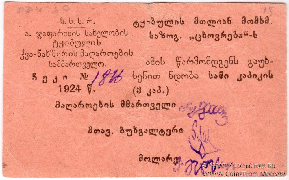 На аверсе: текст на грузинском языке, без серии, номер рукописный 4-значный, подписи факсимиле (управляющий, главбух, кассир). Печать на реверсе.