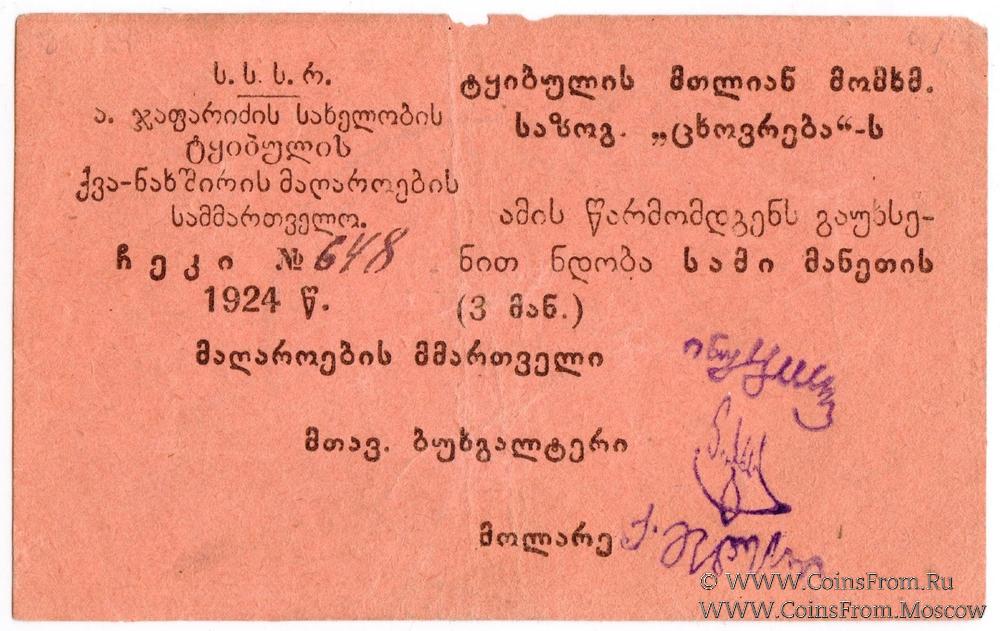 Чек. На аверсе: текст на грузинском языке, без серии, номер рукописный 3-значный, подписи факсимиле (управляющий, главбух, кассир). Печать на реверсе.