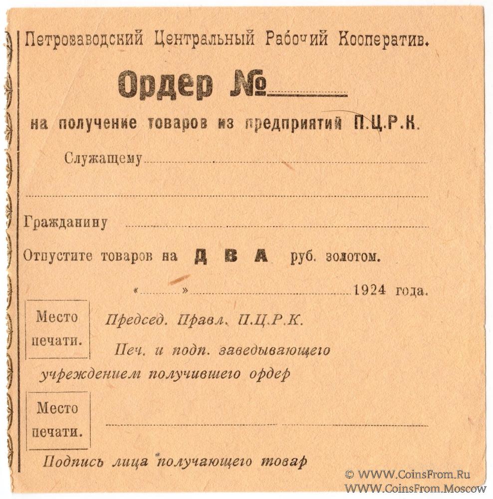Ордер 1924 г. в золотом исчислении. Петрозаводский Центральный Рабочий Кооператив (П.Ц.Р.К.).