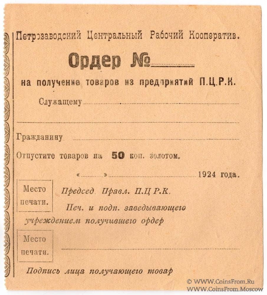 Ордер 1924 г. в золотом исчислении. Петрозаводский Центральный Рабочий Кооператив (П.Ц.Р.К.).