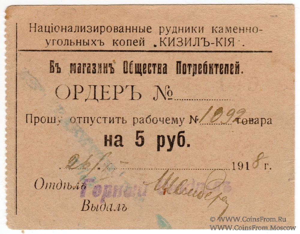 Ордер. Бумага цветная (бежевая). Штамп "Горный Отдъл" (горный отдел). Гашение. Без номера. Национализированные рудники каменно-угольных копей "Кизил-Кия".