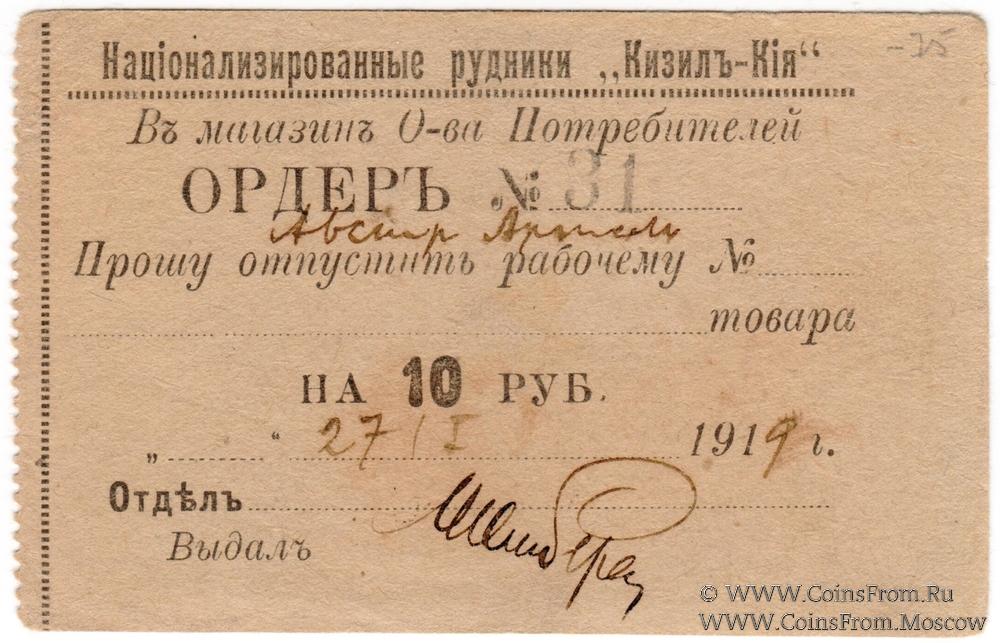 Ордер. Бумага серая. Штамп на реверсе. Национализированные рудники "Кизил-Кия".