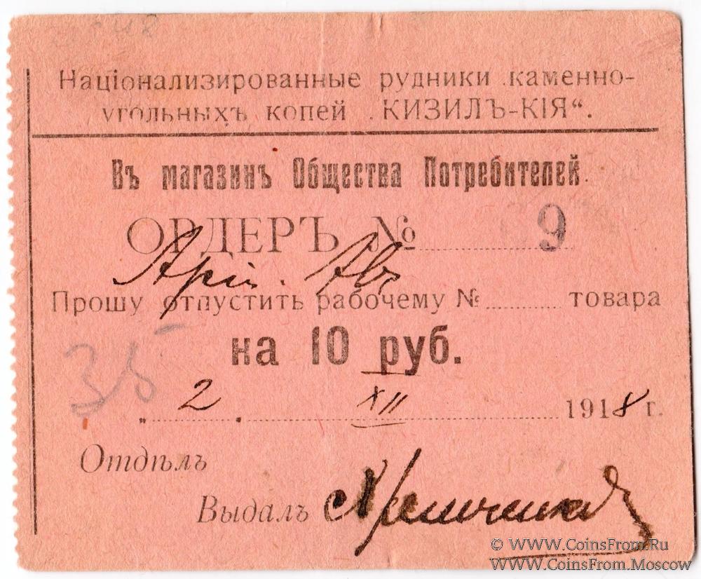 Ордер. Бумага цветная (розовая). Национализированные рудники каменно-угольных копей "Кизил-Кия".