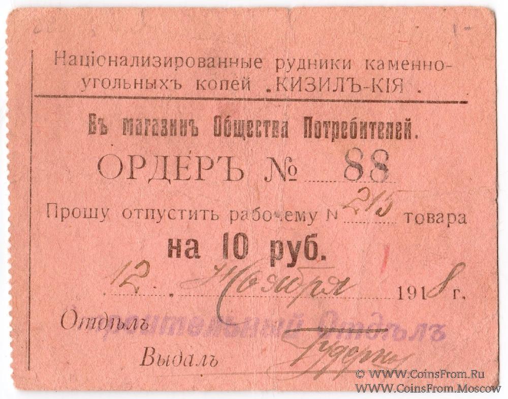 Ордер. Бумага цветная (розовая). Штамп "Строительный Отдъл" (строительный отдел). Национализированные рудники каменно-угольных копей "Кизил-Кия".