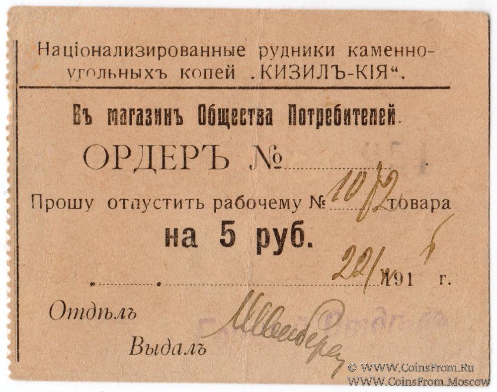 Ордер. Бумага цветная (бежевая). Штамп "Горный Отдъл" (горный отдел). Национализированные рудники каменно-угольных копей "Кизил-Кия".