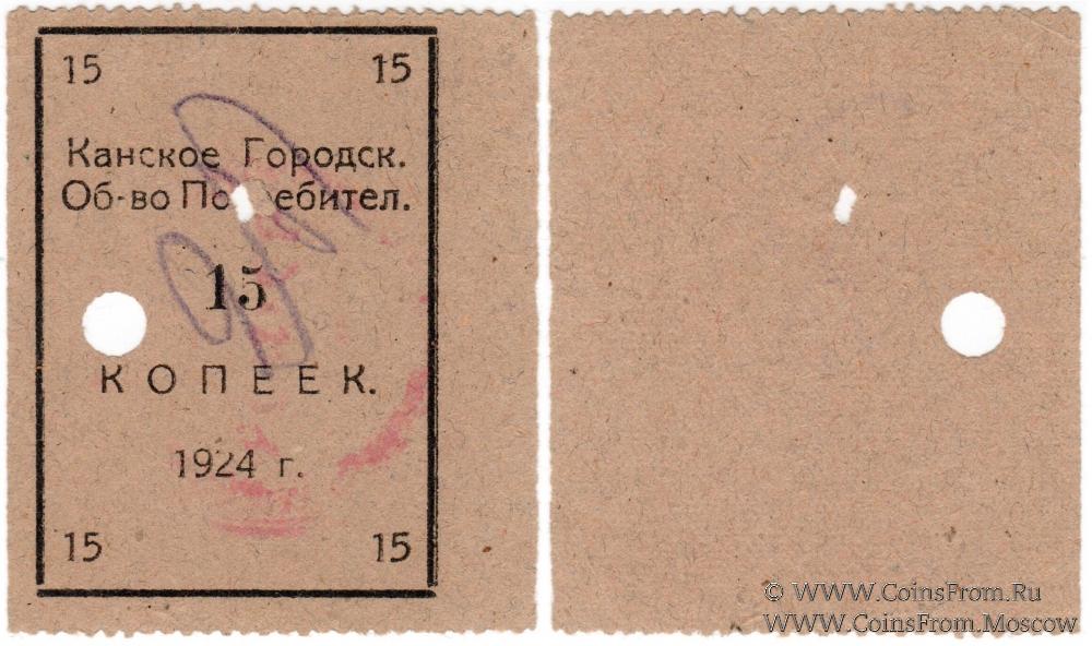 Без названия 1924 г. На аверсе печать "РСФСР". Гашение (1 отверстие). Канское Городское Общество Потребителей.