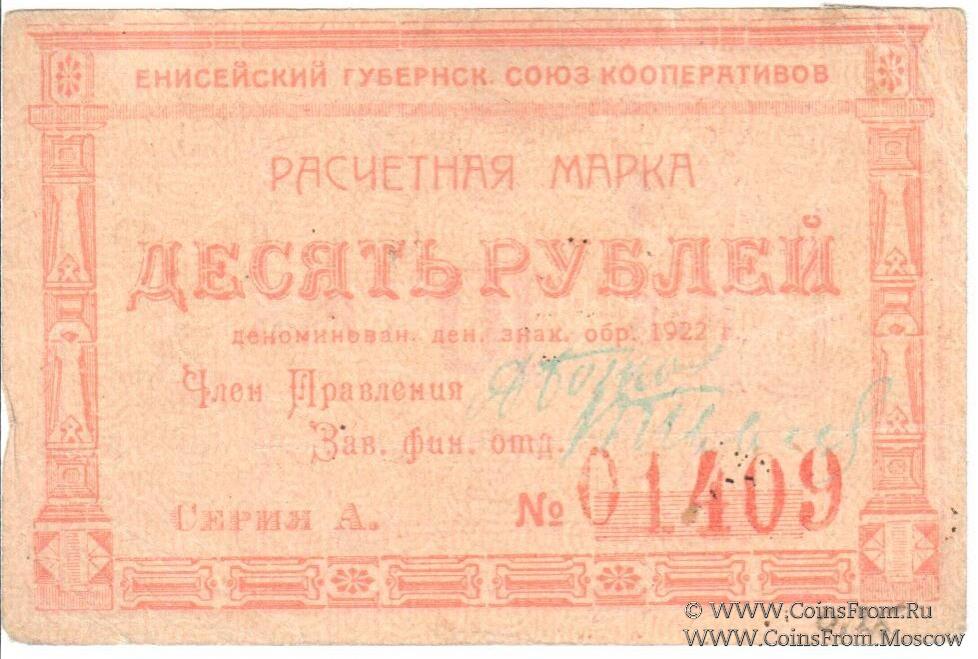 Расчетная марка без даты (1922 г.). Шрифт номинала объемный. Вариант 3 рамки. Енисейский Губернский Союз Кооперативов.