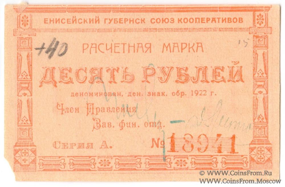Расчетная марка без даты (1922 г.). Шрифт номинала объемный. Вариант 2 рамки. Енисейский Губернский Союз Кооперативов.