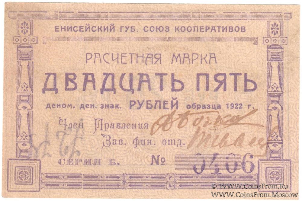 Расчетная марка. Шрифт номинала прямой. Вариант 1 рамки. Слово "губернский" сокращено до "губ.". Енисейский Губернский Союз Кооперативов.