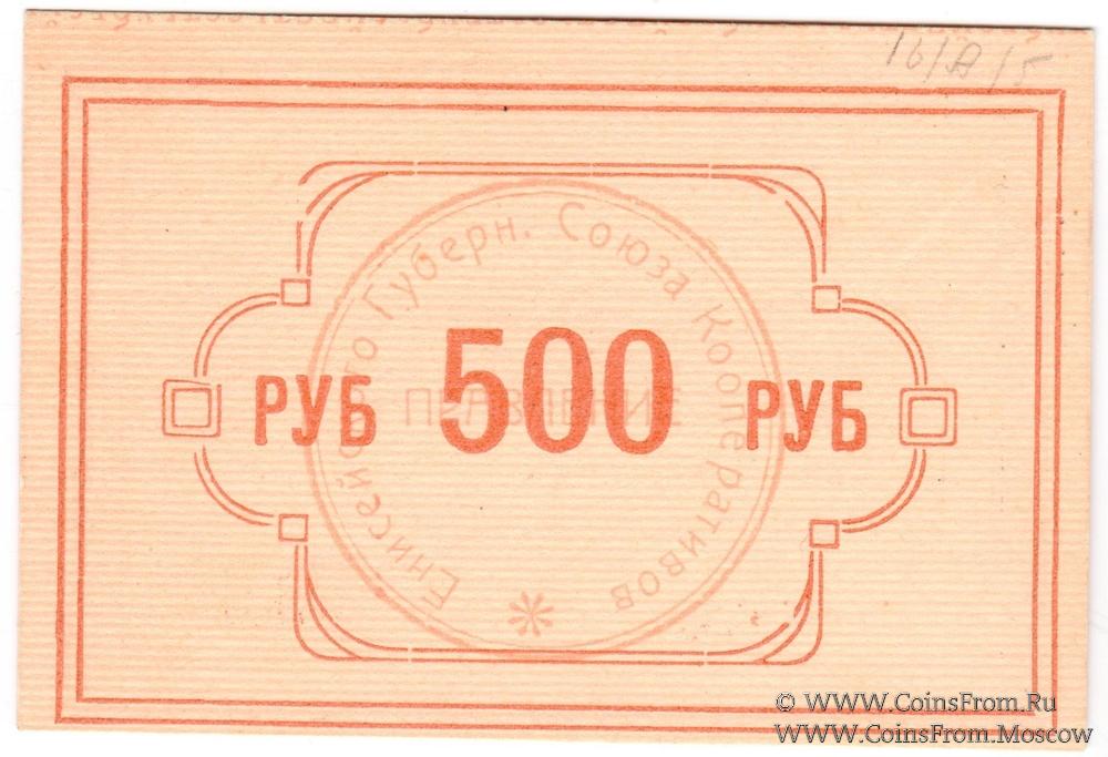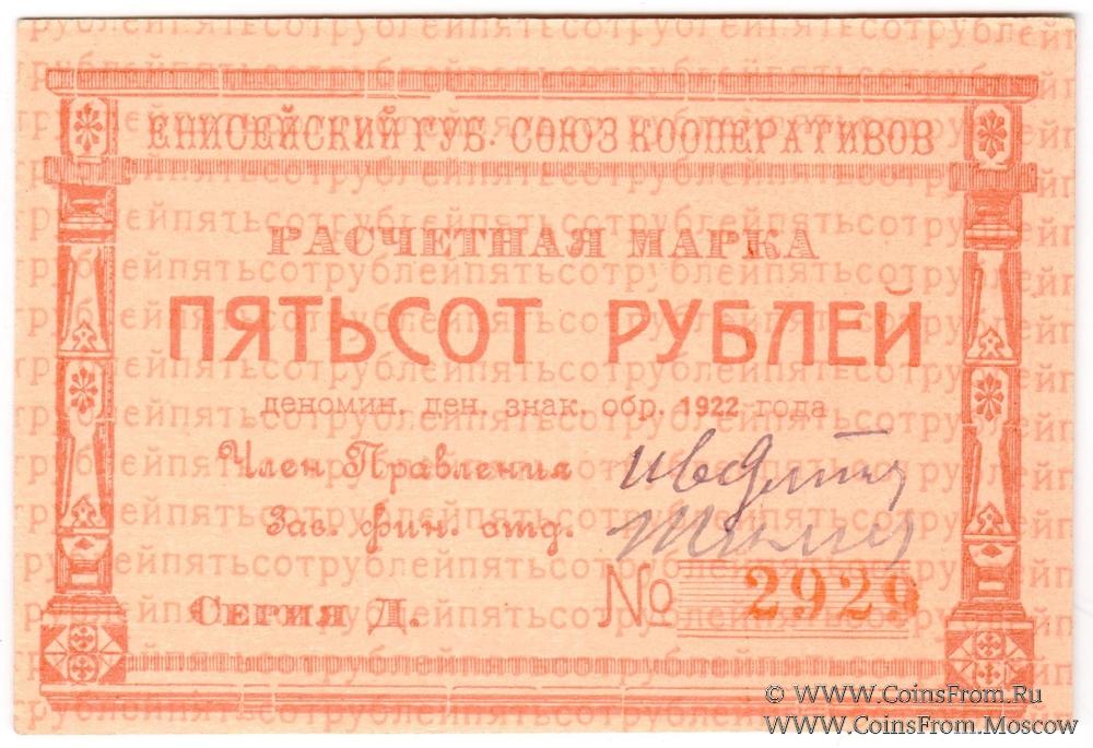 Расчетная марка без даты (1922 г.). Печать на реверсе. Вариант 4 рамки. На плотной бумаге. Енисейский Губернский Союз Кооперативов.