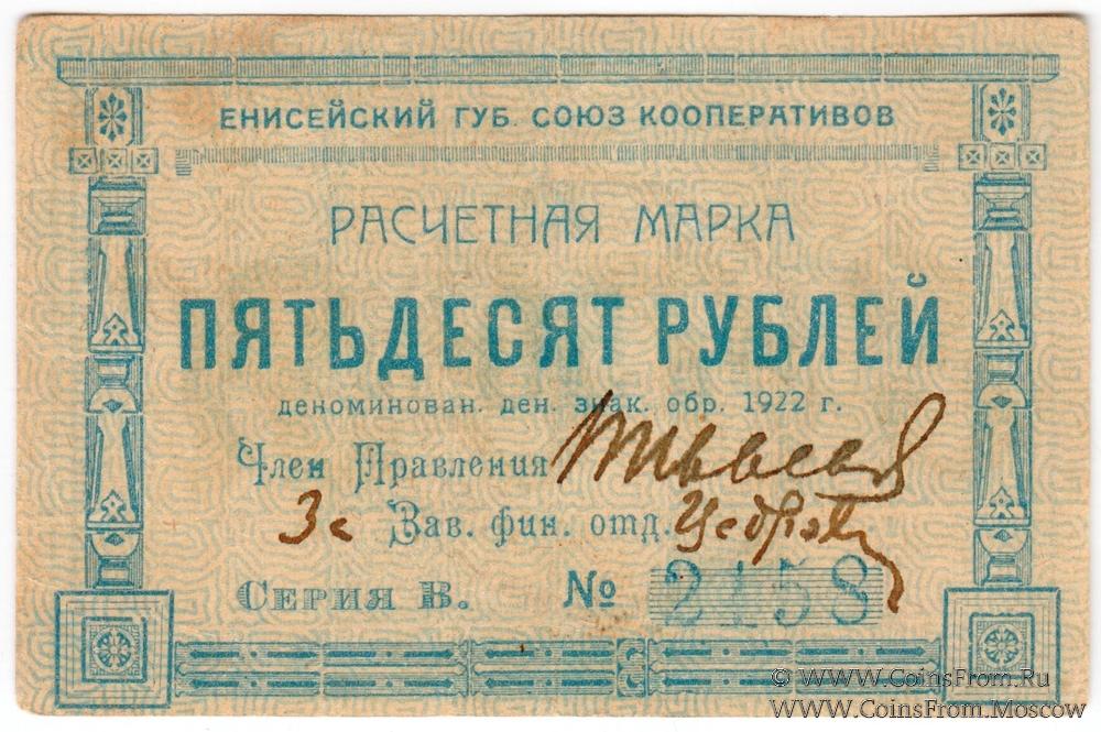Расчетная марка. Шрифт номинала жирный, прямой. Вариант 1 рамки. Енисейский Губернский Союз Кооперативов.