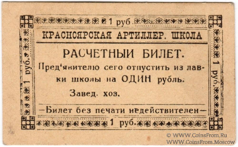 Расчетный билет без даты. Бланк. Красноярская Артиллерийская школа комсостава Р.К.К.А.