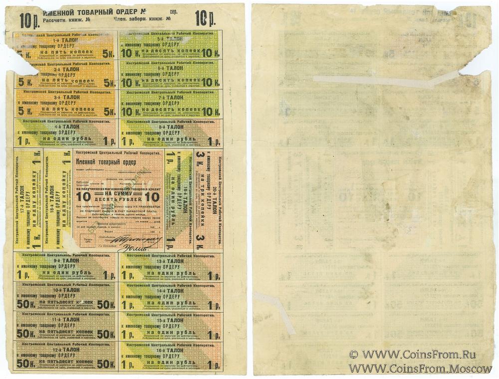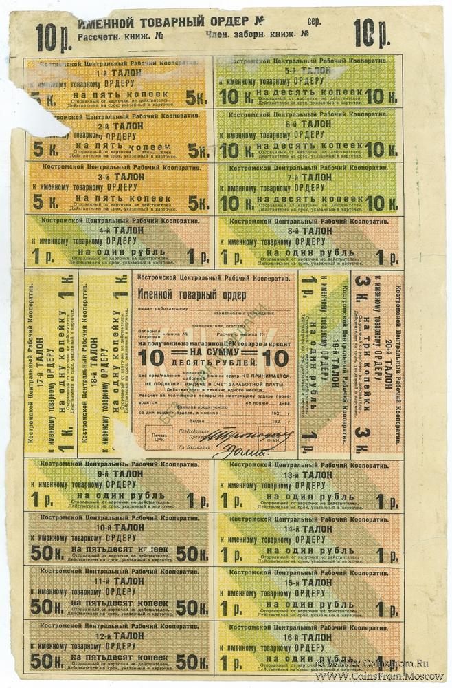 Именной товарный ордер. 20 талонов различного номинала и один талон на получение товаров в кредит с подписью Председателя Правления и Главного Бухгалтера.