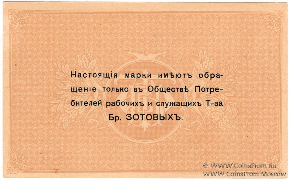 Марка без даты. Реверс жёлтый. Общество потребителей рабочих и служащих т-ва Братьев Зотовых.