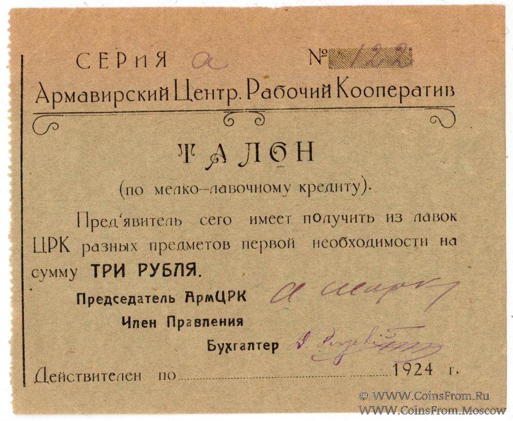 Талон. Без печати, с подписями ответственных лиц. Армавирский Центральный Рабочий Кооператив.