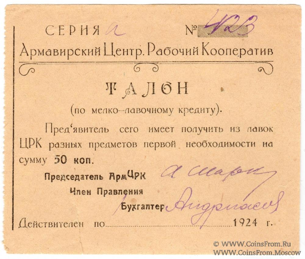 Талон. Бланк с оттиском печати ЦРК, подписями ответственных лиц. Армавирский Центральный Рабочий Кооператив.