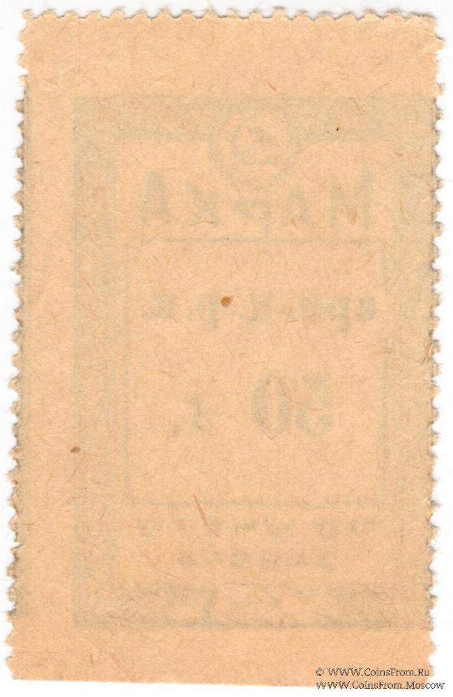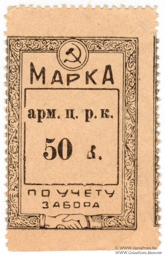 Марка без даты. БРАК печати: непропечатка буквы "К.", сдвиг рисунка. Зубцы с трех сторон. Арм. Ц.Р.К. (Армавирский Центральный Рабочий Кооператив).