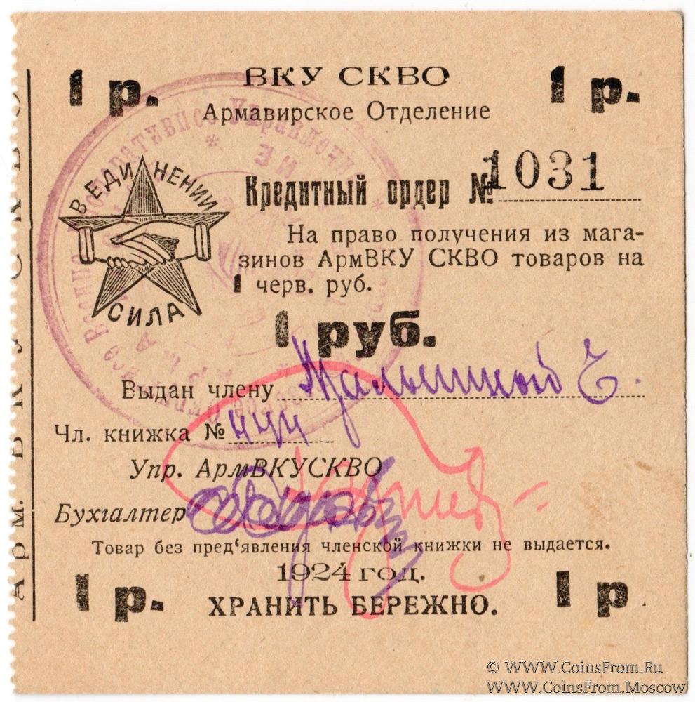Печать круглая: "Северо-Кавказское Окружное Военно-Кооперативное Управление * " (по большому кругу) / " * АРМАВИРСКОЕ ОТДЕЛЕНИЕ * " (по малому кругу) / Рукопожатие на фоне звезды и надпись "В ЕДИНЕНИИ СИЛА" (по центру).