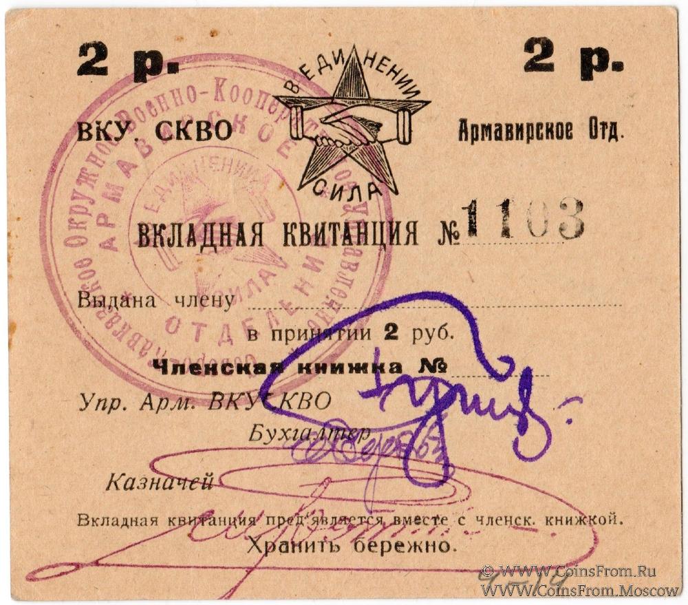 Печать круглая: "Северо-Кавказское Окружное Военно-Кооперативное Управление * " (по большому кругу) / " * АРМАВИРСКОЕ ОТДЕЛЕНИЕ * " (по малому кругу) / Рукопожатие на фоне звезды и надпись "В ЕДИНЕНИИ СИЛА" (по центру).