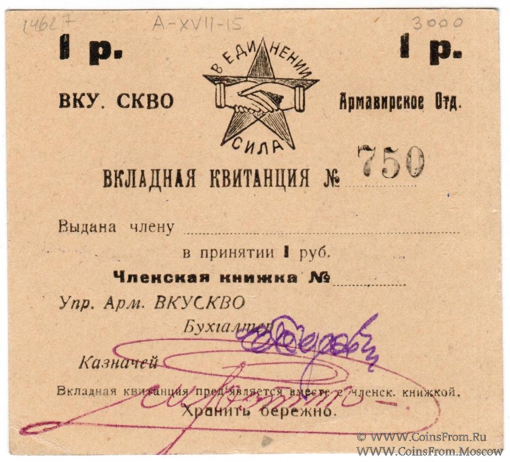 Вкладная квитанция. Без печати. Отделение ВКУ СКВО (Военно-Кооперативное управление Северо-Кавказского Военного Округа).