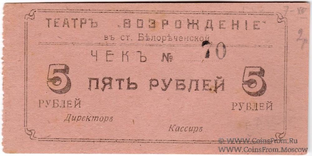 Чек (1919 г.) без даты. Театр "Возрождение" в станице Белореченской.