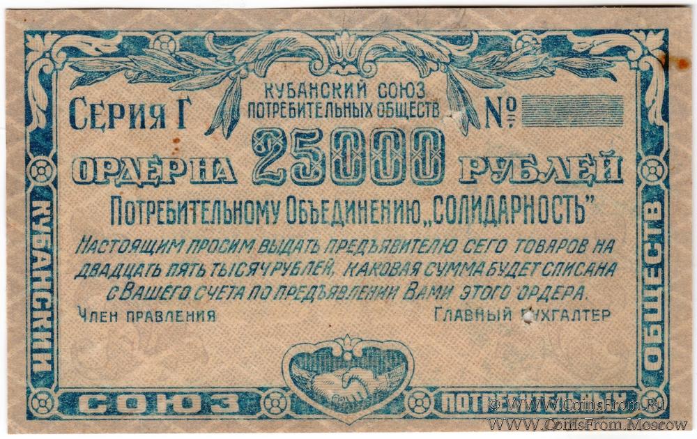 Ордер. Серия Г. Бланк, без подписей. Потребительское Объединение "СОЛИДАРНОСТЬ". Кубанский Союз Потребительских Обществ (КСПО). Кубсоюз.