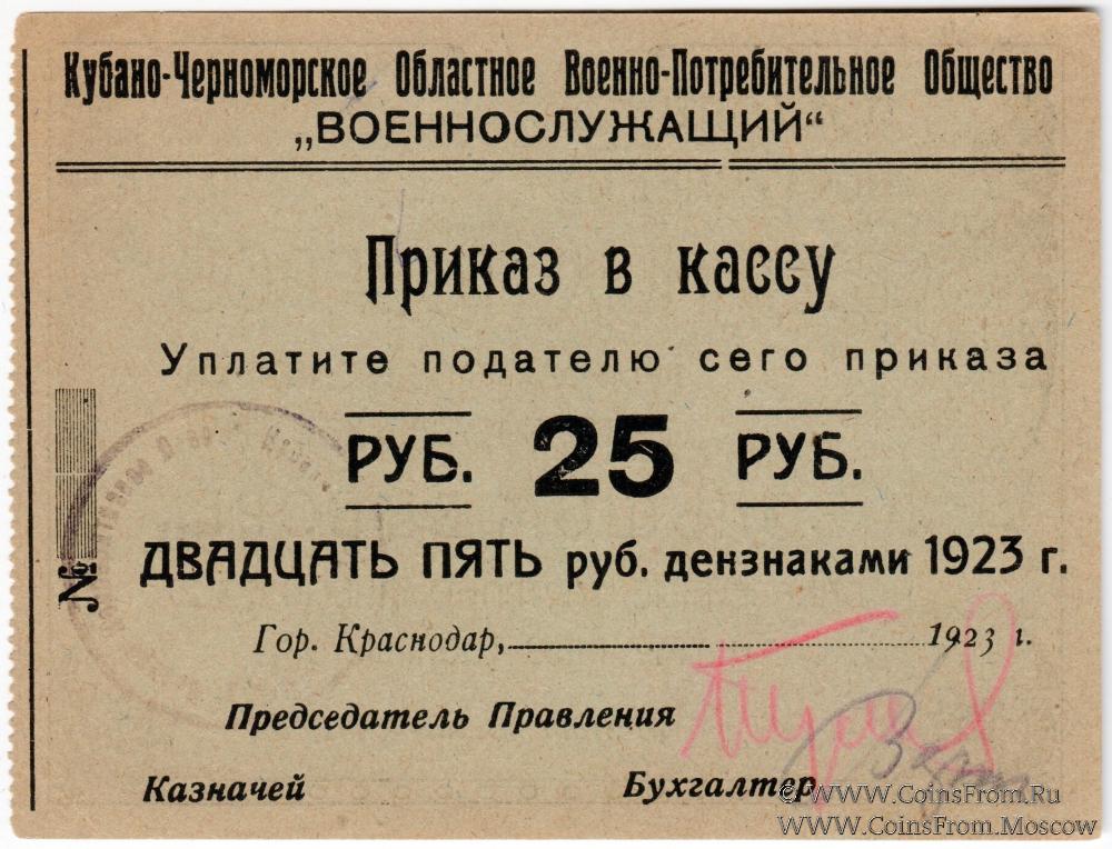 Приказ в кассу 1923 г. Без номера. Кубано-Черноморское Областное Военно-Потребительское Общество "ВОЕННОСЛУЖАЩИЙ".