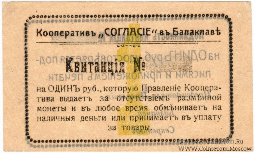 Квитанция без даты. Бланк. Цифра номинала узкая. Кооператив "СОГЛАСИЕ" в Балаклаве.