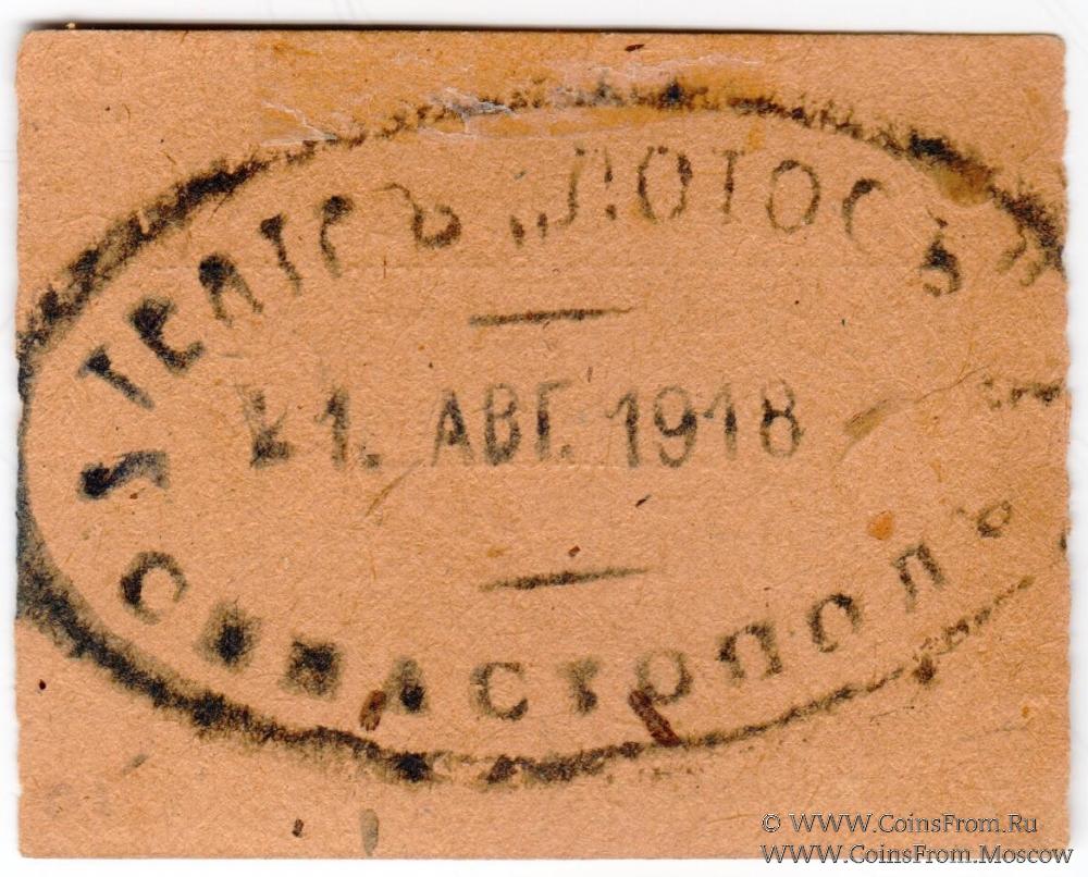 Разменная марка. Бумага коричневая плотная. Штамп овальный на реверсе с датой 21 августа 1918 г. Театр "ЛОТОС".