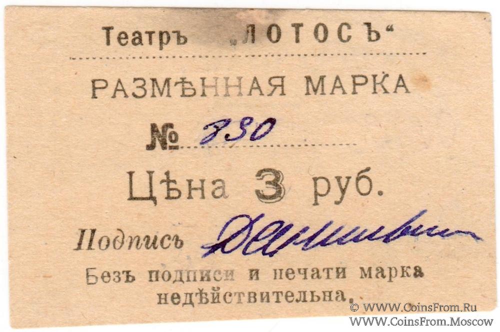 Разменная марка. Бумага белая тонкая. Штамп овальный на реверсе с датой 8 апреля 1918 г. Театр "ЛОТОС".