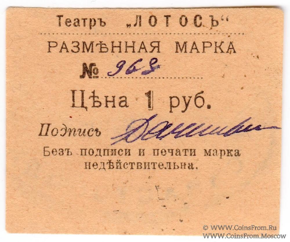 Разменная марка. Бумага кремовая тонкая. Штамп овальный на реверсе с датой 9 мая 1918 г. Театр "ЛОТОС".