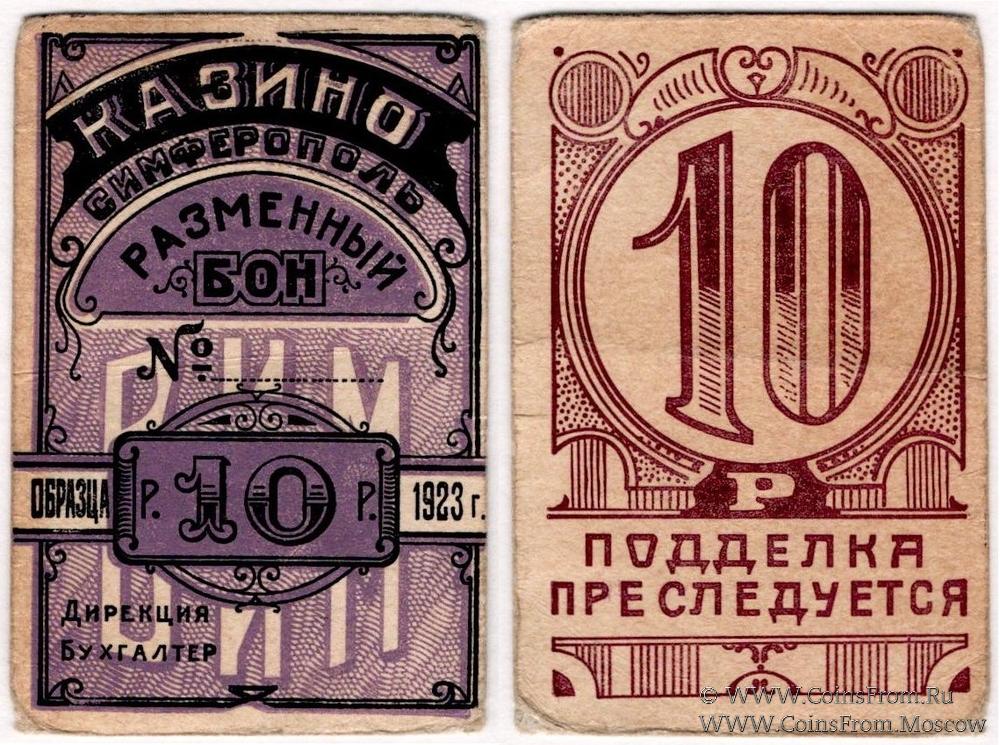 Разменный бон 1923 г. Бланк. Фон цветной. Толстая бумага. На реверсе "Р" без точки. Казино (ВИМ) г. Симферополь.