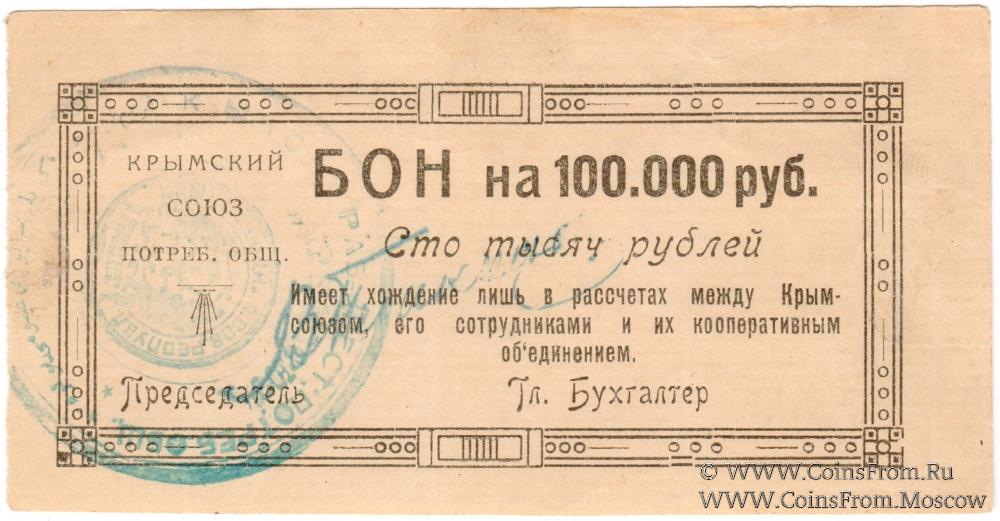 Бон без даты (1921 г.). Печать (44 мм) и подписи на аверсе. Крымский союз потребительских обществ.