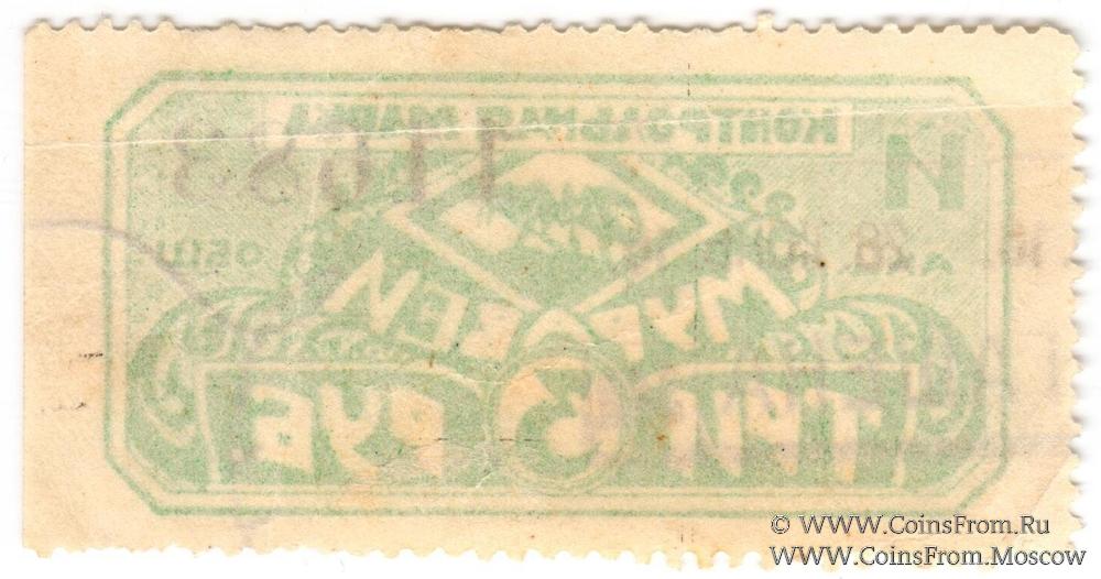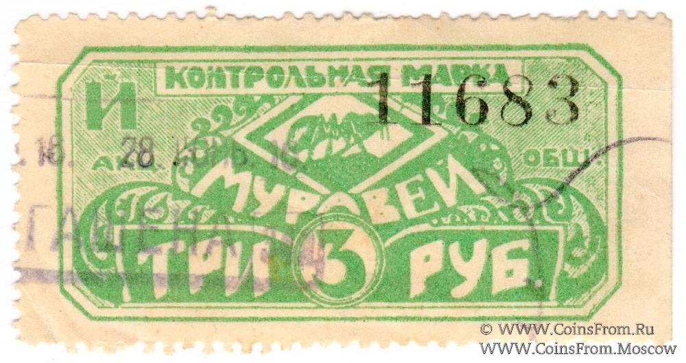 Контрольная марка без даты (1916 г.). Зубцовка с 3-х сторон. На аверсе штамп "ПОГАШЕНА" с датой (28.06.1916) и подписью факсимиле. Акционерное общество "МУРАВЕЙ".