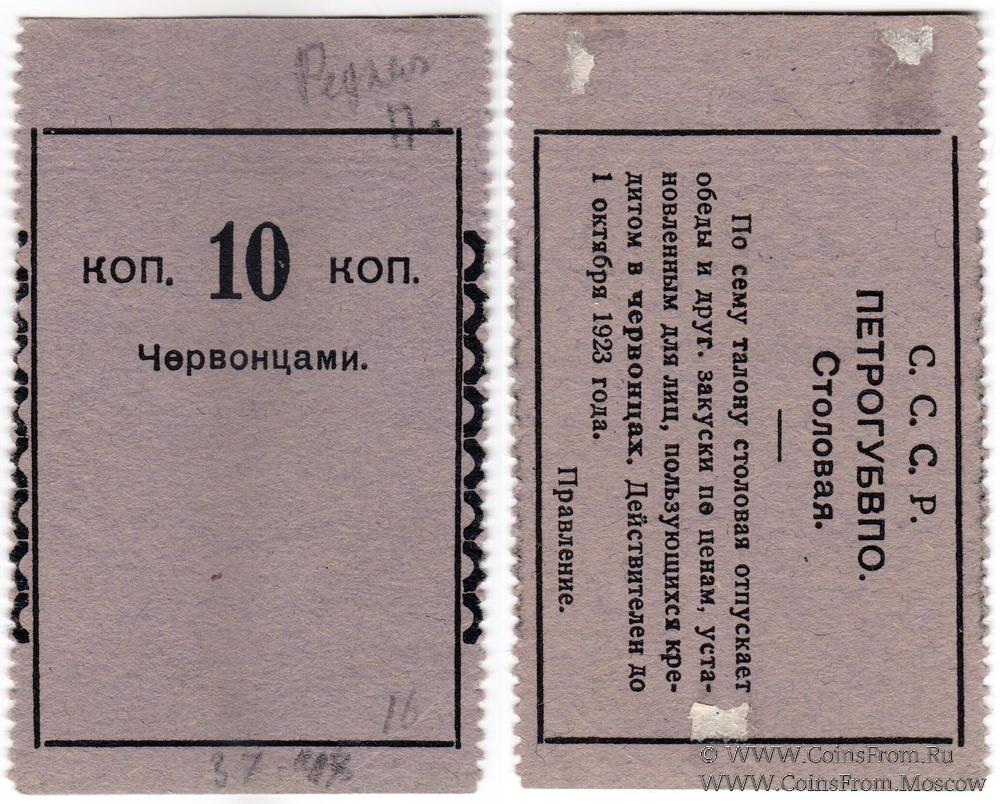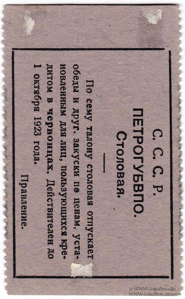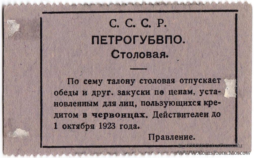 Талон (в червонцах, действителен до 1 октября 1923 г.). Бланк. Фиолетовый. Столовая. ПЕТРОГУБВПО (Петроградское Губернское Военно-Потребительское Общество).