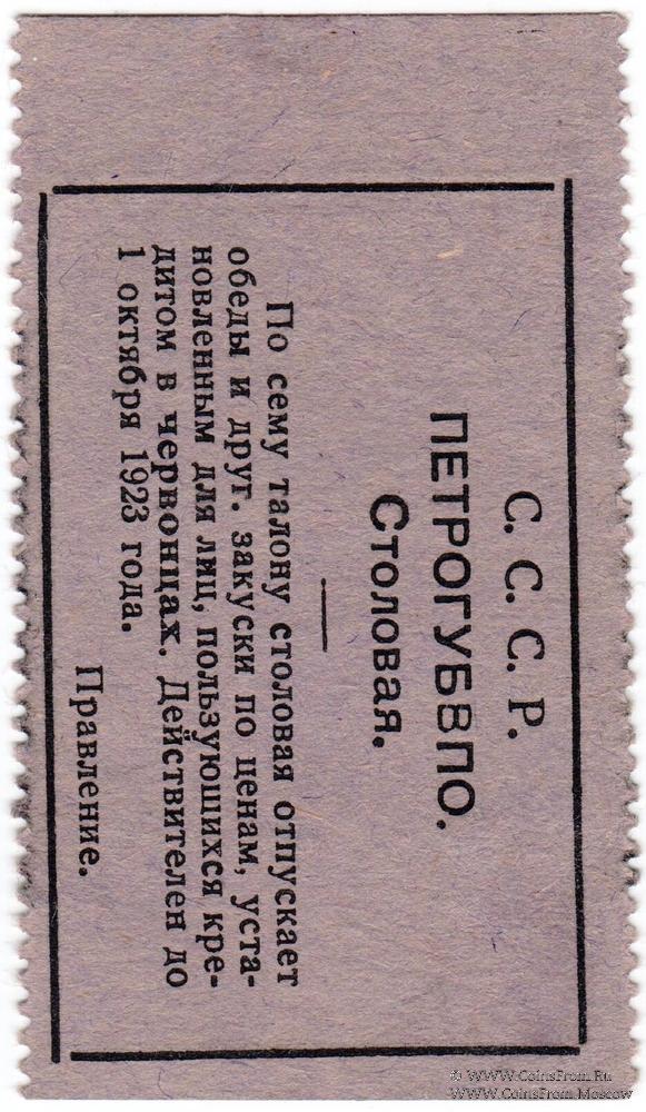 Талон (в червонцах, действителен до 1 октября 1923 г.). ОБРАЗЕЦ: надпись от руки по диагонали слова "Образец". Фиолетовый. С печатью. Столовая. ПЕТРОГУБВПО (Петроградское Губернское Военно-Потребительское Общество).