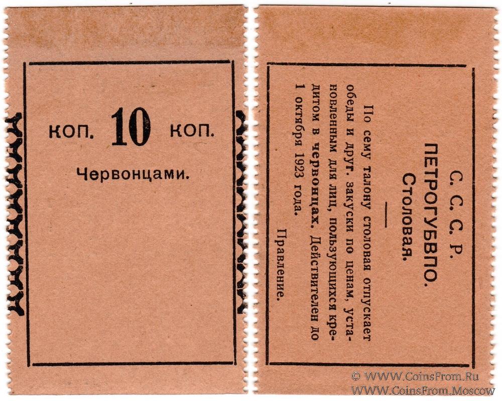 Талон (в червонцах, действителен до 1 октября 1923 г.). Бланк. Коричневый. Столовая. ПЕТРОГУБВПО (Петроградское Губернское Военно-Потребительское Общество).