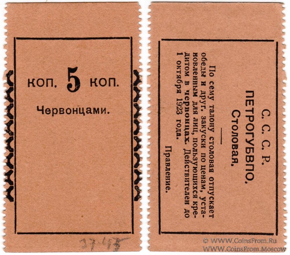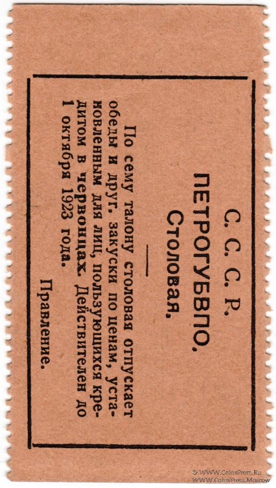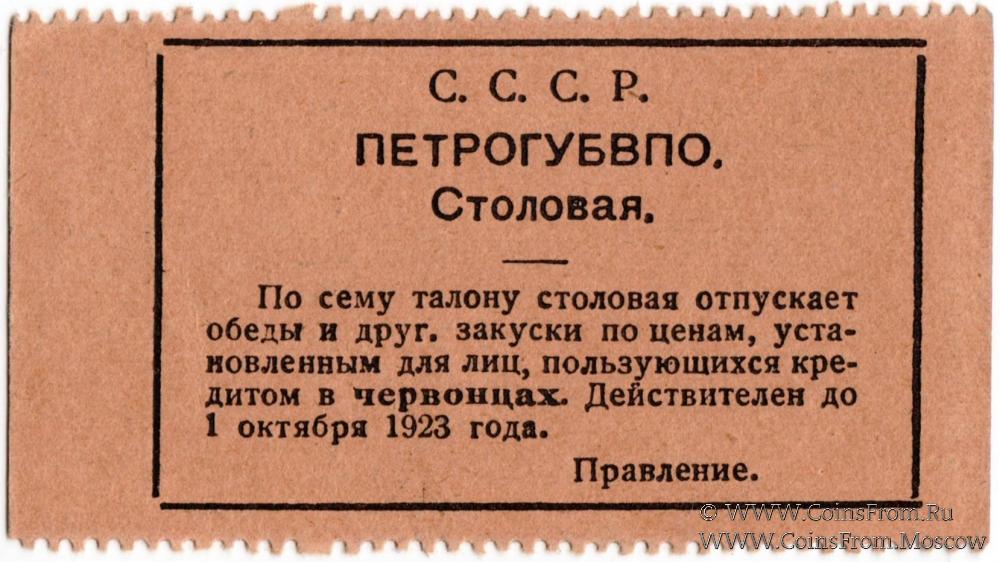 Талон (в червонцах, действителен до 1 октября 1923 г.). Бланк. Коричневый. Столовая. ПЕТРОГУБВПО (Петроградское Губернское Военно-Потребительское Общество).