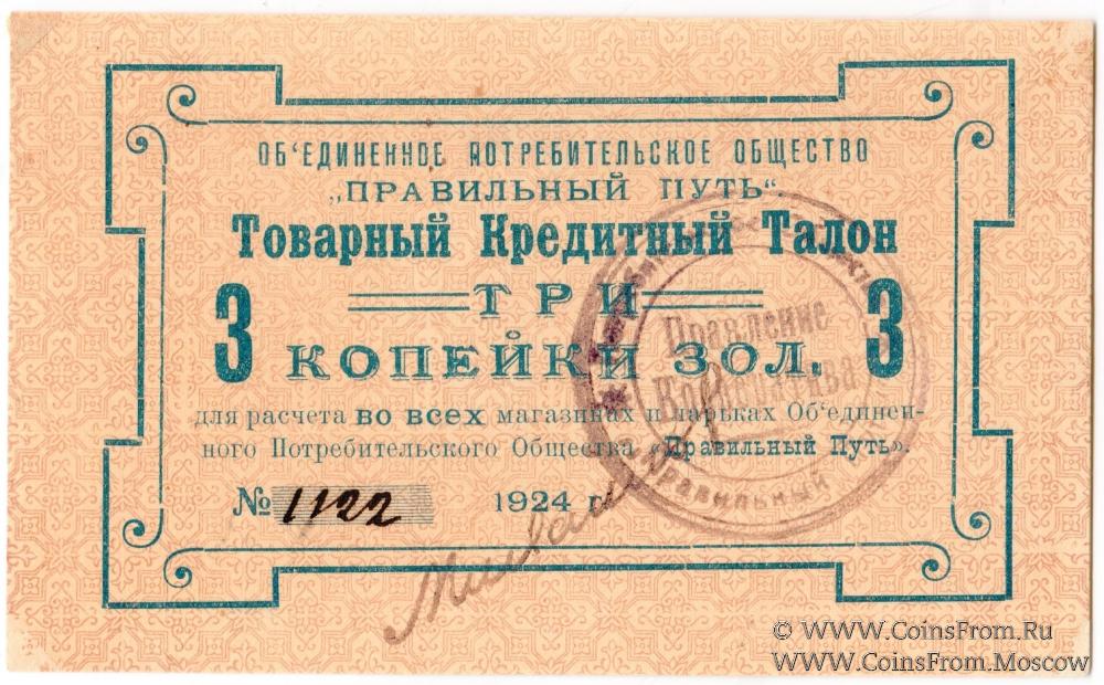 Товарный кредитный талон (золотом). Объединенное потребительское общество "Правильный путь".