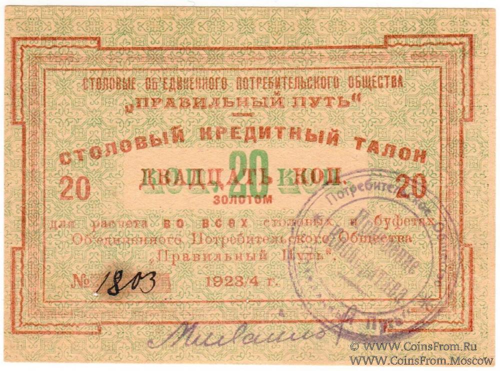 Столовый кредитный талон (золотом). Шрифт коричневый. Печать Правления. Объединенное Потребительское Общество "Правильный путь".