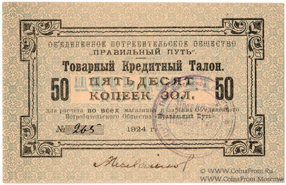 Товарный кредитный талон (золотом). Объединенное потребительское общество "Правильный путь".